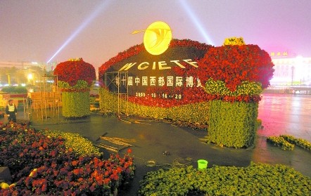 昨晚,绿化工人在天府广场搭建植物雕塑,摆出西博会的会标。为了迎接西博会,市林业和园林局在新会展、天府广场等地设置了18组大型植物雕塑。在人民东路,西博会的植物雕塑是在迎国庆的植物雕塑的骨架上稍加改动,以免浪费。
