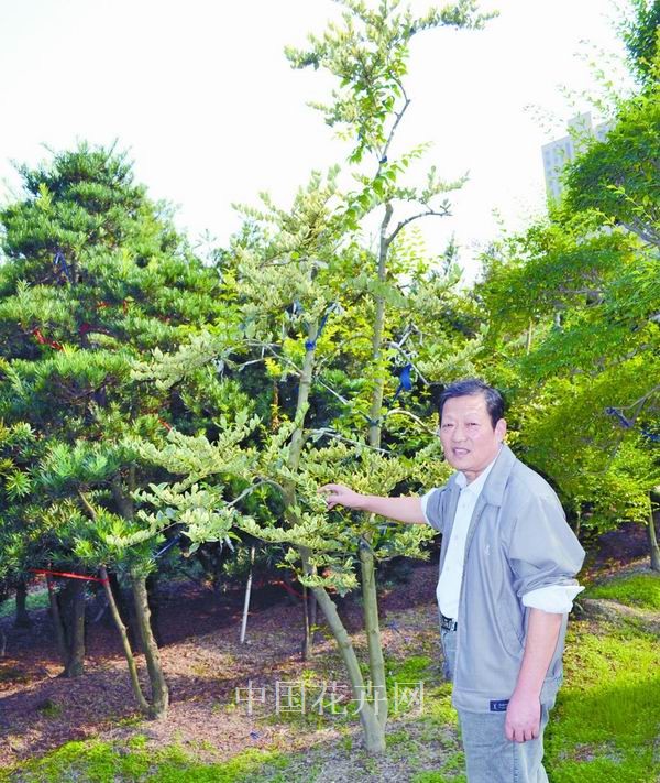 图为杭州萧山盈一盆景花木场场长蒋金土在介绍小叶女贞如何实现升级。
