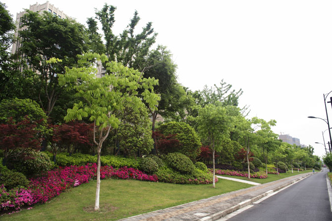 本工程绿化面积约32万平方米米,工程内容包括绿化、园路铺装及恢复, 灌溉管线安装等。工程施工现场分两个标段,一标段绿化面积为:145170.3平方米,二标段绿化面积为:175417.6平方米。其中一标段种植大小乔木1685株,移栽及处理残株1751株,灌木55976平方米,草皮85594.3平方米,园路铺装2556平方米,修复487平方米,灌溉管线安装3376米;二标段种植大小乔木2873株,移栽及处理残1054株,灌木43697平方米,草皮125390平方米,园路铺装3127平方米,修复655平方米,灌溉管线安装3565米;经三路至塘工局路养护标段面积为:41335平方米。