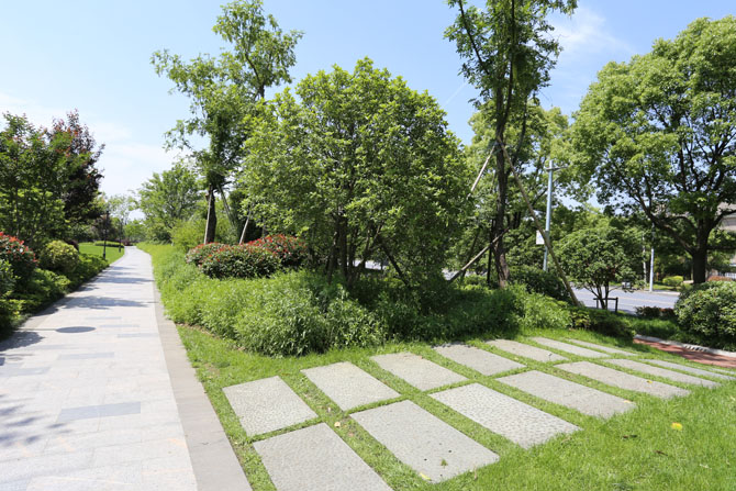 丰富植物色彩营造整体效果。植物配置也是该工程的景观营造的一大亮点,在配置方面采用多种植物品种,将各种植物自然搭配,营造出丰富的植物群落;林下灌木、色块、草坡丰富了绿化层次,达到了“自然、生态”的效果;特别注重江浙地区乡土树种的应用,如朴树、香樟、玉兰、桂花等树种,树体高大、树形多姿,苍翠挺拔,极具地域特色。丰富的植物配置呈现出春可赏花,夏可乘凉,秋可赏叶,冬可踏雪的人间美景,提高了三江两岸滨水区生物的多样性,使岸线景观与山水融为一体,凸显山水人文景观。