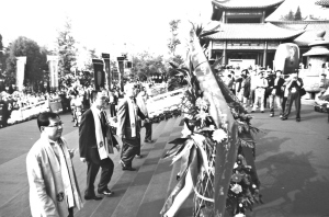 2007年5月14日中国风景园林高层论坛在北京举行。北京清华城市规划设计研究院院长尹稚(左一),中国风景园林协会秘书长甘伟林(左二),中国风景园林协会理事长周干峙(右二),国际风景园林师联合会主席戴安妮·孟赛斯博士(右一)参加了论坛。